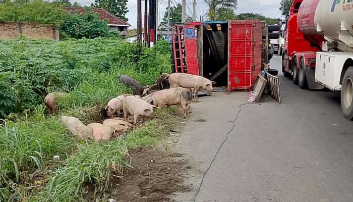 Kecelakaan Mobil Truck Babi Terguling, Puluhan Ekor Berlarian ke Kebun Singkong*